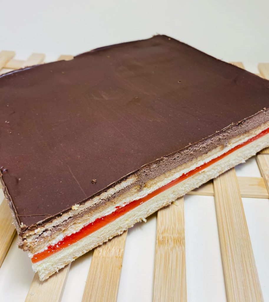 Harmonijne połączenie lekkości i intensywnego smaku. Warstwa puszystego biszkoptu, owocowa galaretka i pyszny krem tworzą idealną całość.